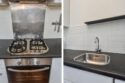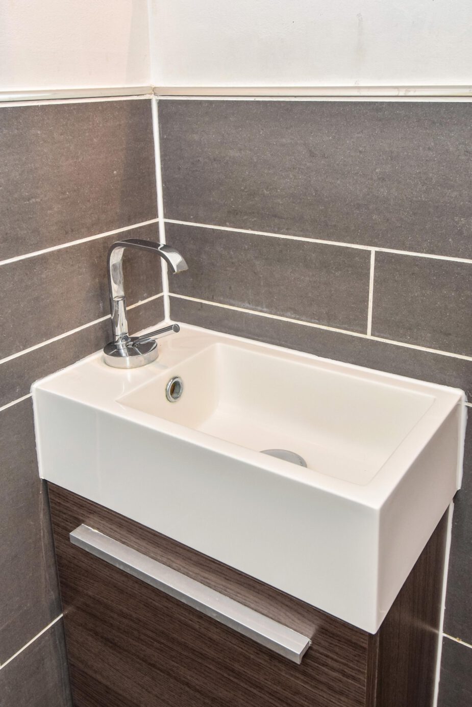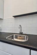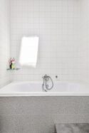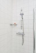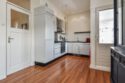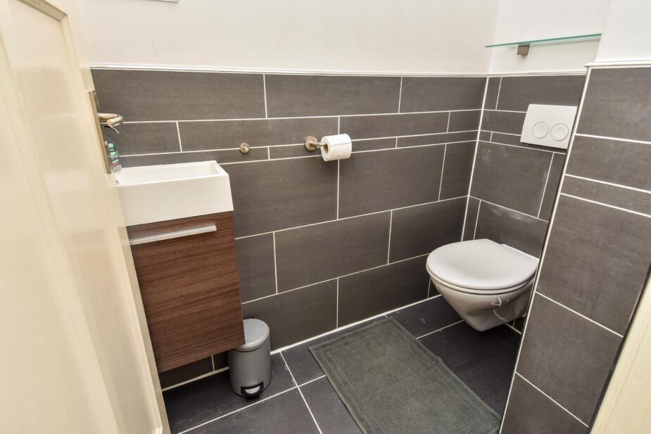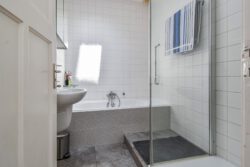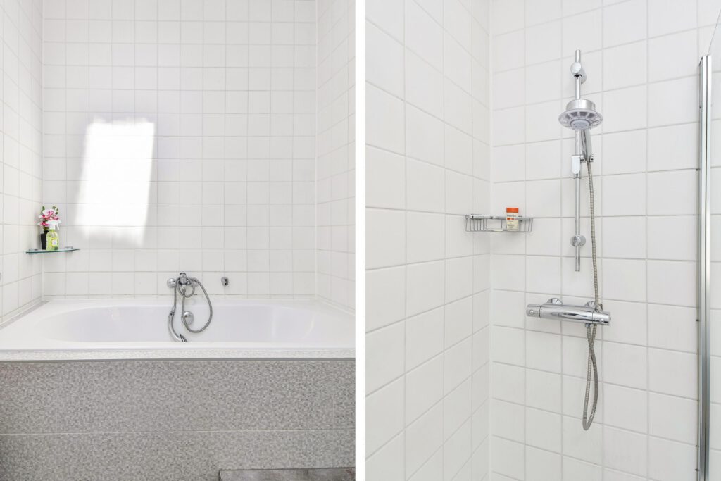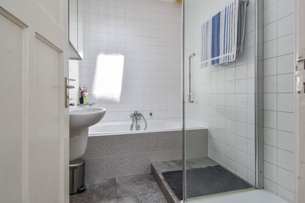De badkamer is uitgerust met ligbad, aparte douche, wastafel en daklicht. Daarnaast zijn er een separaat toilet en een praktische bergkast met ruimte voor cv-ketel, wasmachine en droger. Het appartement is voorzien van laminaatvloeren en dubbele beglazing.