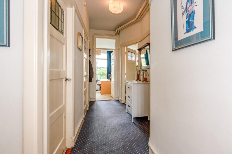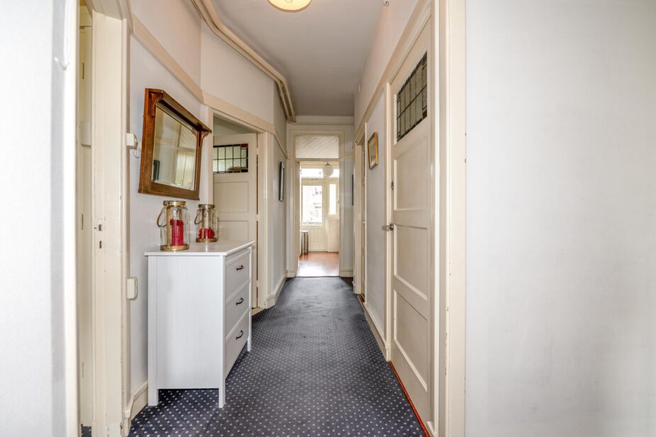 Indeling: Entree via open Haags portiek naar de eerste etage. Binnenkomst in de hal met toegang tot alle vertrekken. De ruime en lichte woon-/eetkamer te scheiden doormiddel van schuifseparatie met authentiek glas-in-lood biedt aan de achterzijde openslaande deuren met toegang tot het balkon over de gehele breedte van de woning (zuidwesten), ideaal om te genieten van de middag- en avondzon.