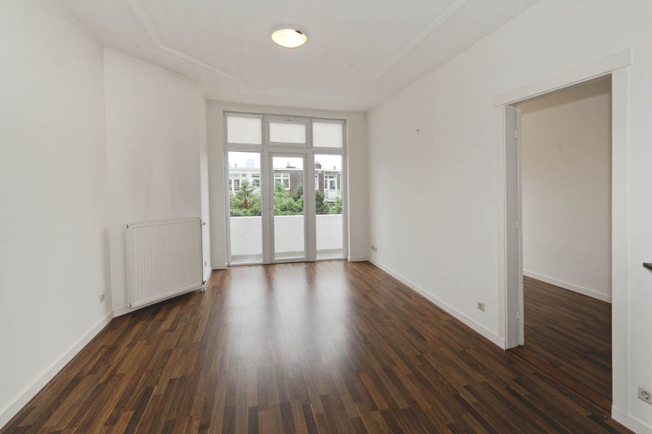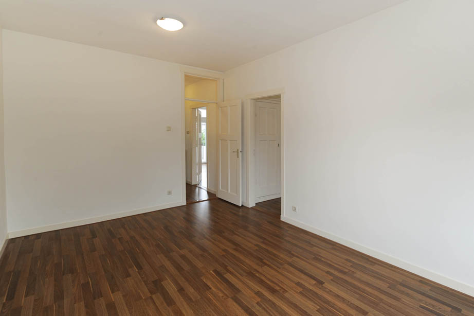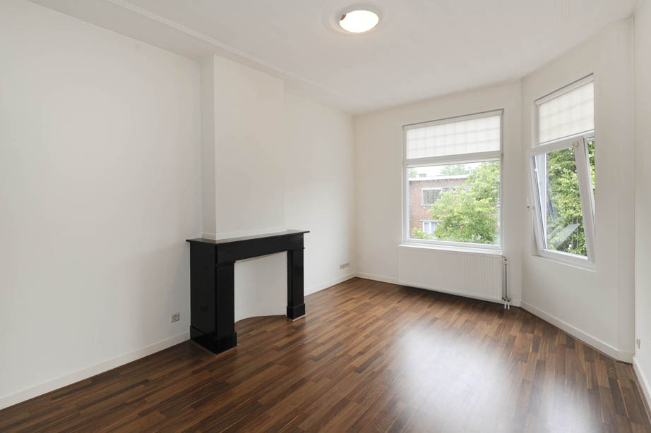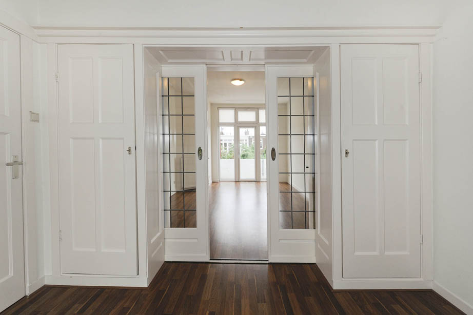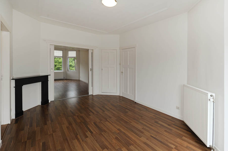 Entree via goed onderhouden portiek en binnentrap. Grote kamer ensuite met de originele schuifdeuren en kasten. In de voorkamer is een erker en een zwart marmeren schouw, in de achterkamer zijn openslaande deuren naar het balkon wat op het zuidwesten ligt.