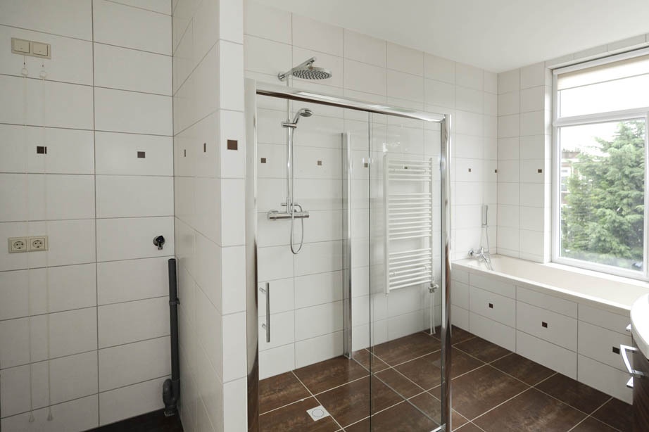 Luxe badkamer met ligbad, inloop-/regendouche, wastafel en designradiator. Apart toilet in de hal.