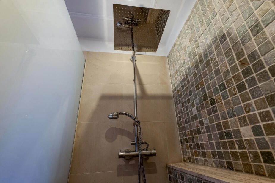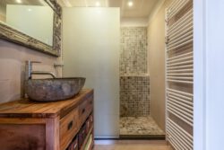 Fijne badkamer met inloop-/regendouche, wastafel en handdoekradiator.