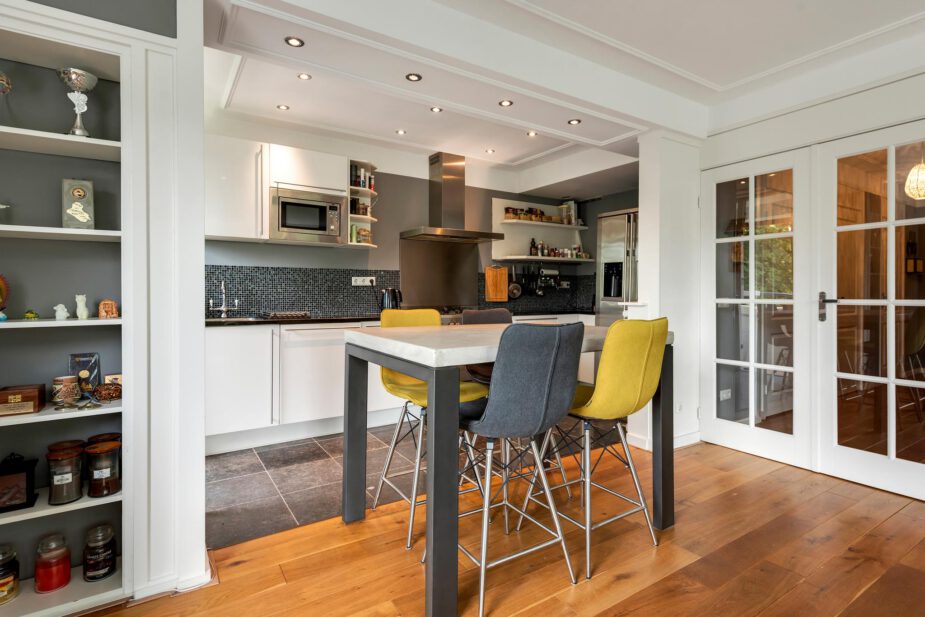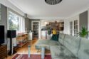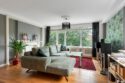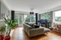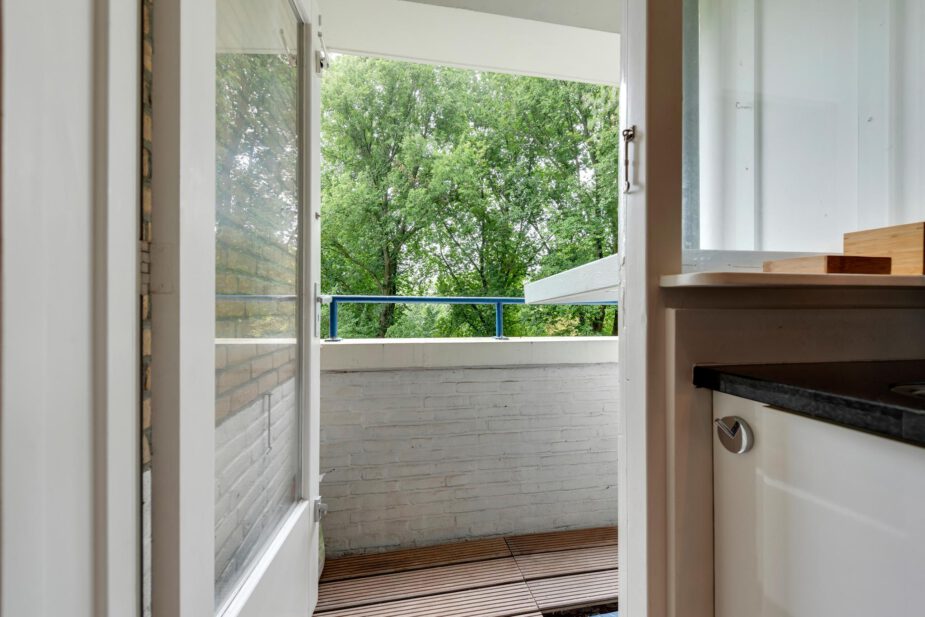 Dubbele deuren naar de woonkamer, die een rustgevend uitzicht heeft over de groene omgeving en een deur naar het zonnige balkon op het westen.