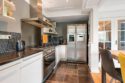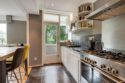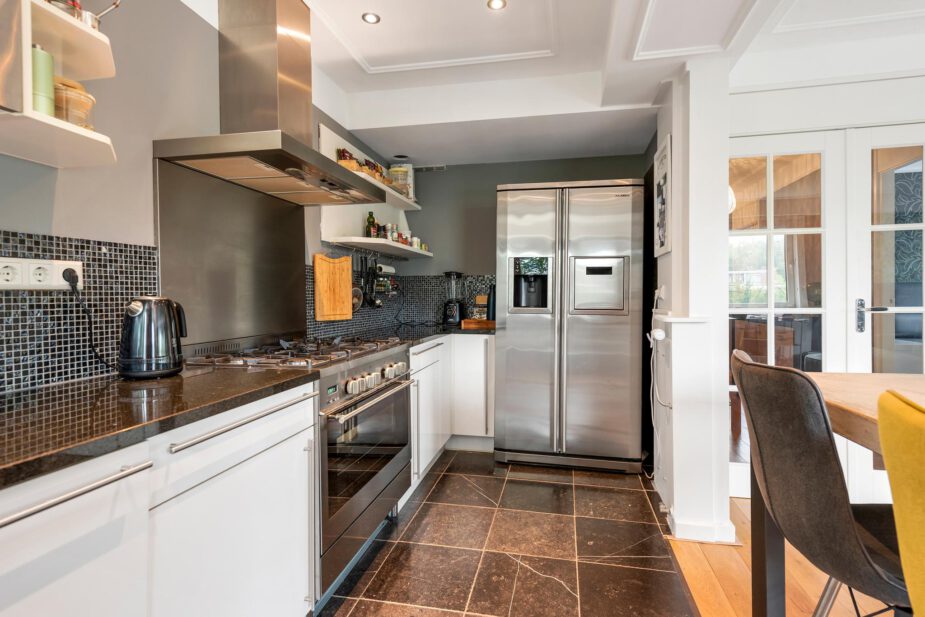 Luxe, halfopen keuken met veel werk- en bergruimte, natuurstenen aanrechtblad, extra breed fornuis met vijf gaspitten en elektrische oven, bijbehorende aluminium wasemkap, Amerikaanse dubbeldeurs koelkast/vriezer met ijsdispenser in de deur, magnetron op ooghoogte en vaatwasmachine. Hier is een deur naar een klein, beschut balkon.