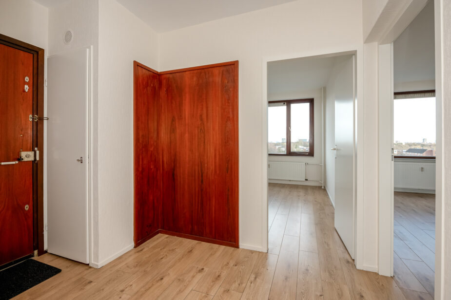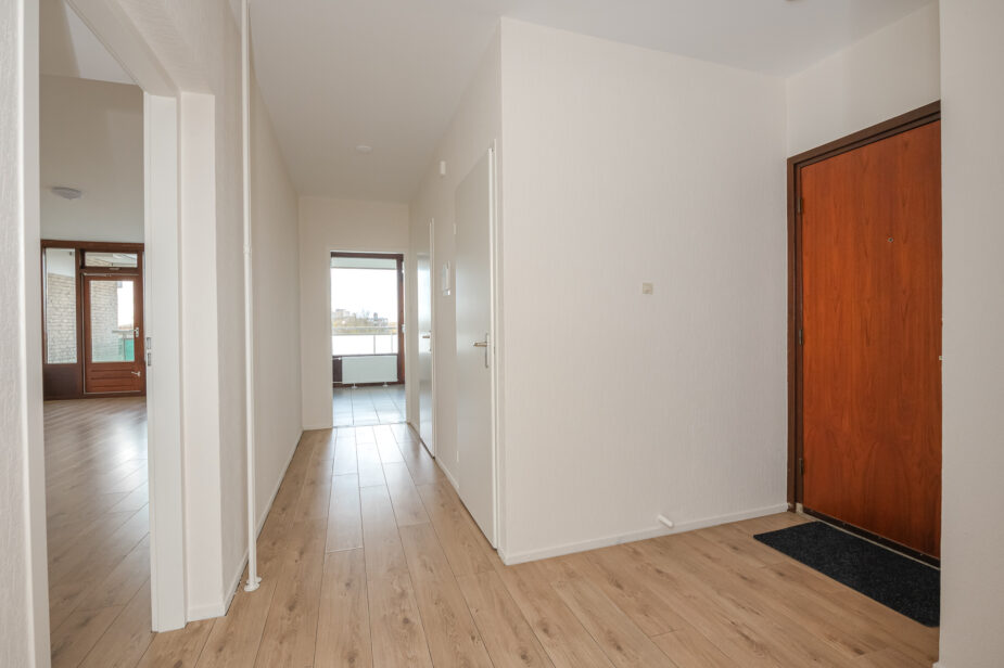 De entree van het gebouw is goed verzorgd en afgesloten, met een nette hal waarin zich het trappenhuis en de liften bevinden. Boven is, na de hardhouten voordeur, een ruime hal met garderobe. De woon-/eetkamer is licht en ruim, met ramen aan twee zijden die zorgen voor een prettige hoeveelheid daglicht. Vanuit deze kamer is er toegang tot een royaal en zonnig balkon. Grote, nette keuken, ook met een deur naar het balkon.