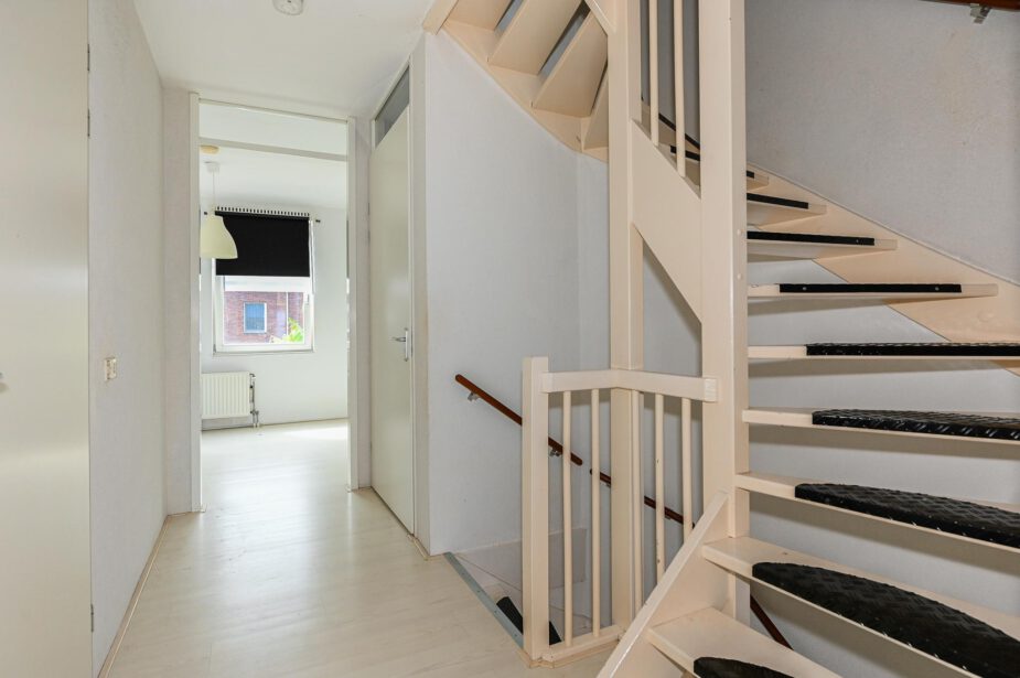 Entree op de begane grond via het kindvriendelijke hofje; ruime hal met meterkast en moderne toiletruimte met fonteintje. Lichte en royale woonkamer voorzien van een nette laminaatvloer, trapkast en een aluminium schuifpui naar de zonnige achtertuin. De tuin op het zuidwesten met een met een houten berging (ca. 2 × 3 m) en achterom;