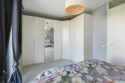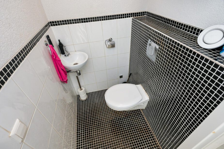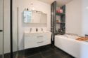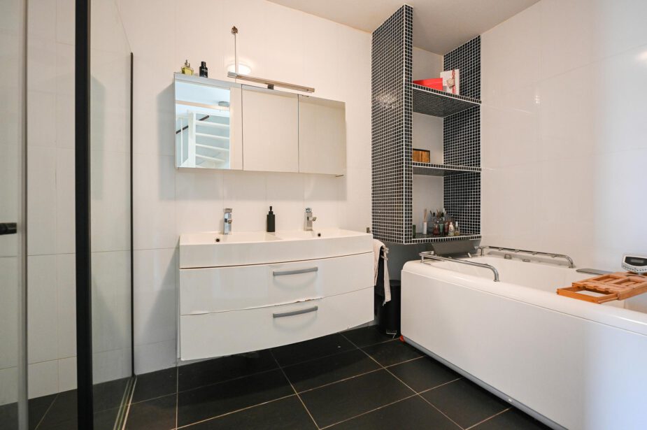 Badkamer in het midden, voorzien van douche en dubbele wastafel; Separate toiletruimte met wandcloset en fonteintje.