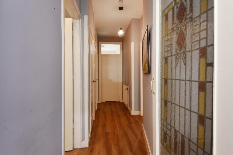 In het hele appartement zijn mooie laminaatvloeren en veel klassieke details, zoals glas-in-lood bovenramen, een mooie marmeren schouw en paneeldeuren.