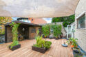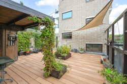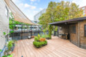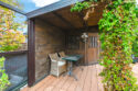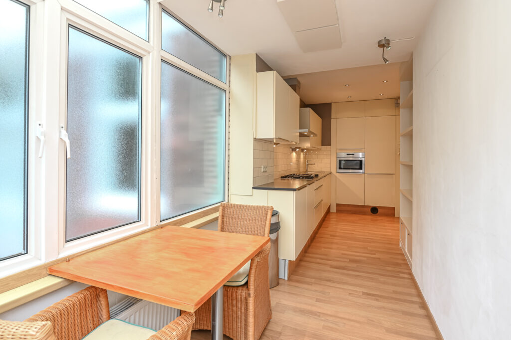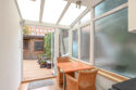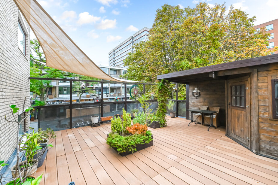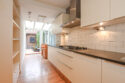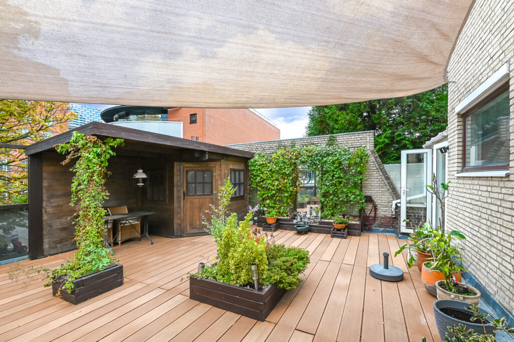 De keuken is halfopen en voorzien van diverse inbouwapparatuur. Aangrenzend bevindt zich een lichte serre met openslaande deuren naar het royale dakterras, waar u de hele dag van de zon kunt genieten. Op het terras staat tevens een praktisch houten berging/schuurtje.