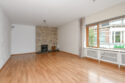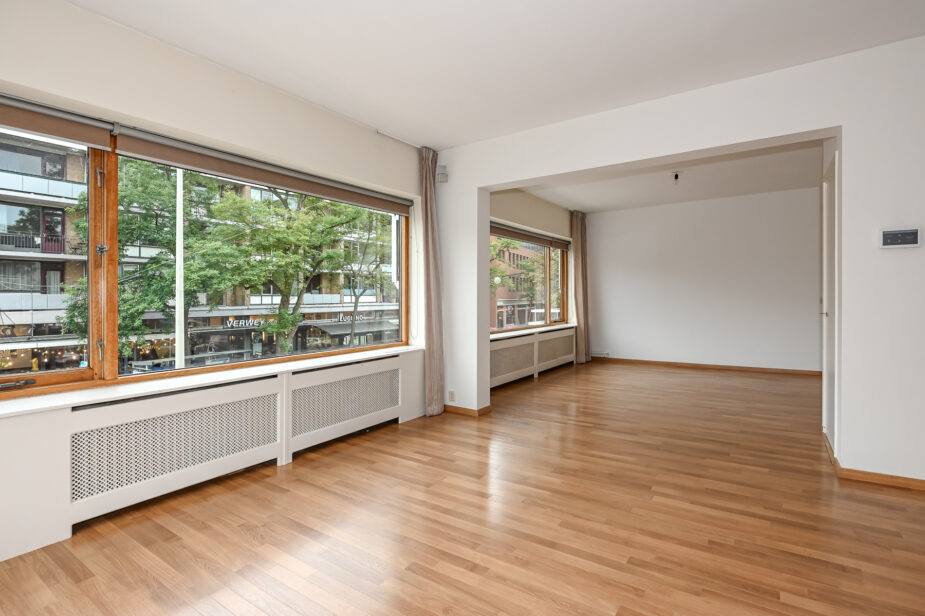 De sfeervolle L-vormige woon-/eetkamer met open haard en vaste kasten bevindt zich op de hoek, met grote raampartijen aan twee zijden en vrij uitzicht. Deze ruimte was oorspronkelijk opgedeeld in een woon- en slaapkamer; indien gewenst kan de tweede slaapkamer eenvoudig worden teruggebracht.