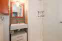 De slaapkamer aan de voorzijde heeft toegang tot een klein balkon met uitzicht op de Theresiastraat. De badkamer beschikt over een inloopdouche en wastafel. Separaat toilet met fontein.